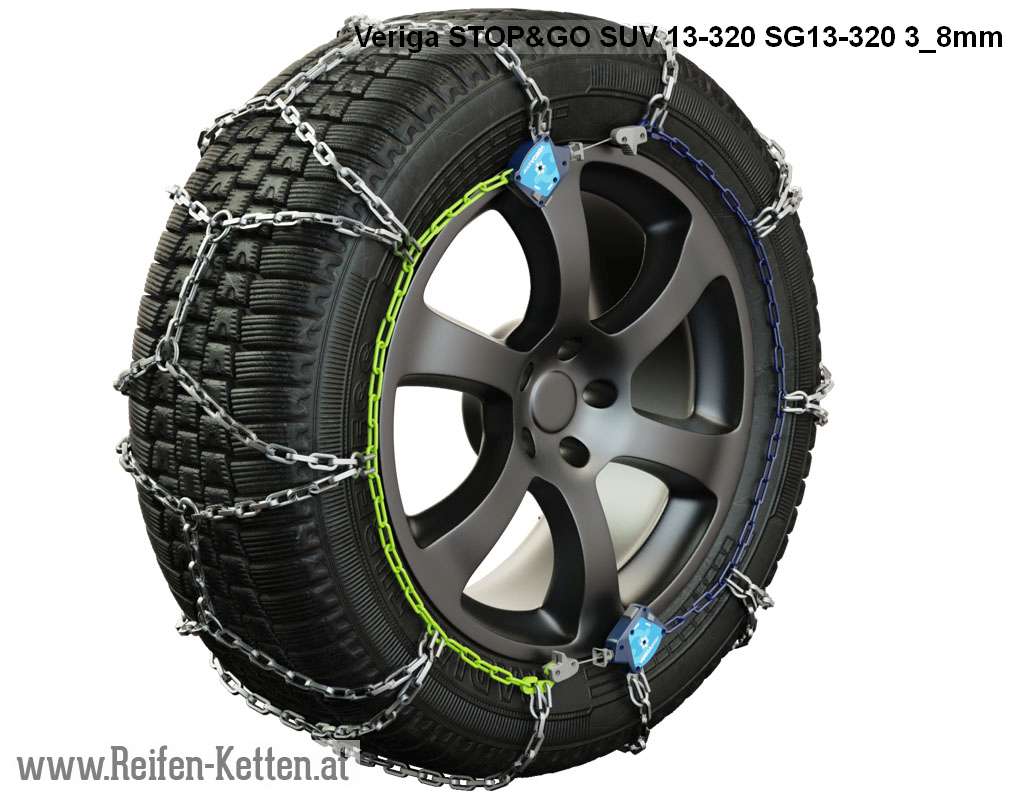 Kette, 13 mm, mit automatischem Spannsystem und selbstständiger Anpassung der Kette an den Reifen. Diese Kette ist speziell für SUV Fahrzeuge, Wohnmobile und Geländewagen entwickelt worden. Zwei patentierte »STOP&GO« Schlösser mit Selbstspannfunktion gewährleisten ein automatisches Nachspannen der Kette selbst während der Fahrt.