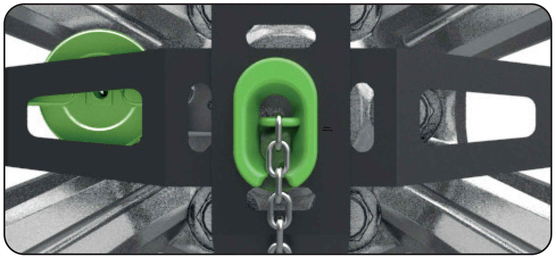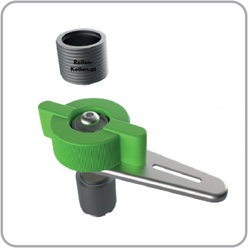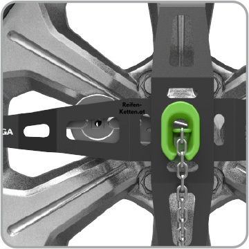 Unsere Kette bietet die Möglichkeit, sich durch Klemmen an einer einzigen Radmutter am Reifen zu befestigen, ohne zusätzliche Anbauteile zu benötigen. Die beigefügten Distanzbolzen ermöglichen eine flexible Einstellung und Montage, selbst auf Felgen mit extrem positiven oder negativen Einpresstiefen (ET).