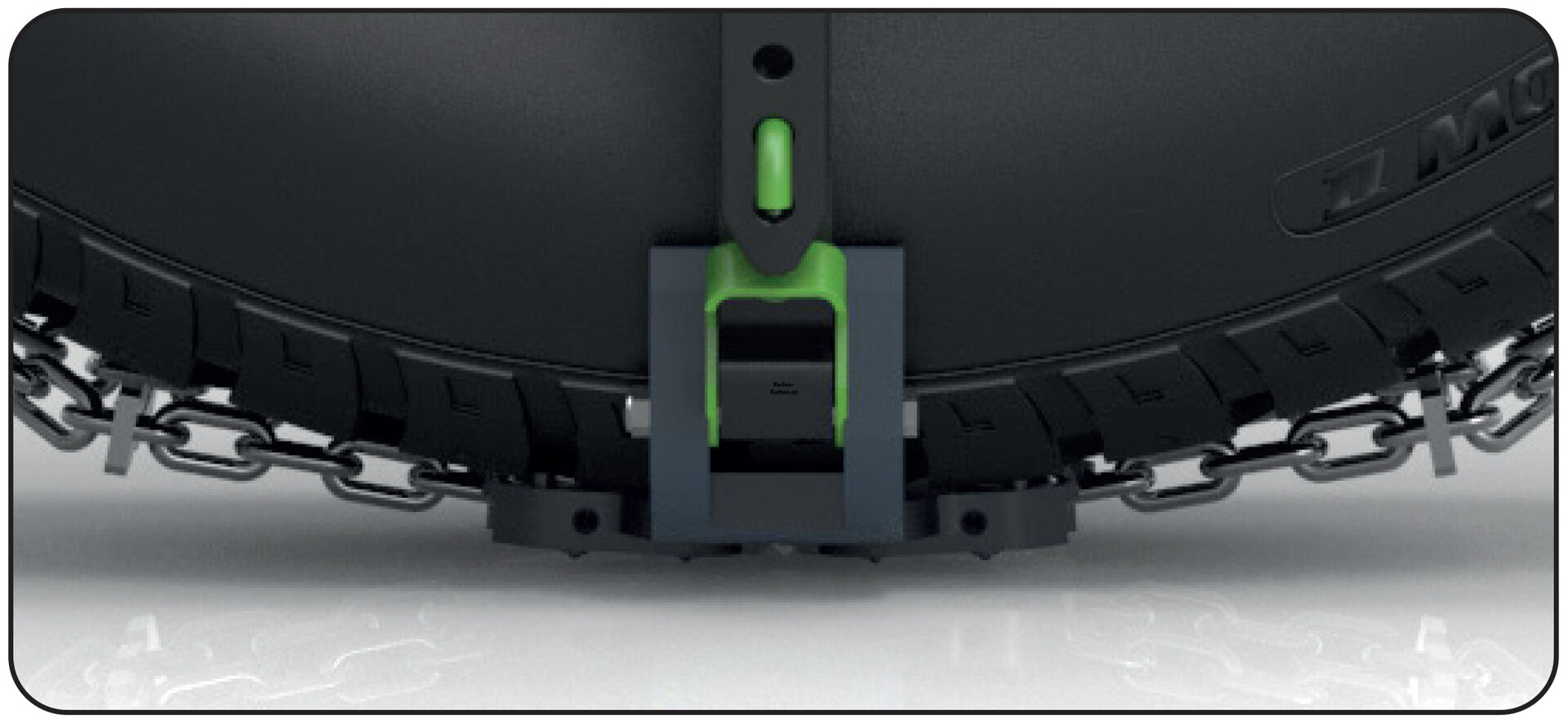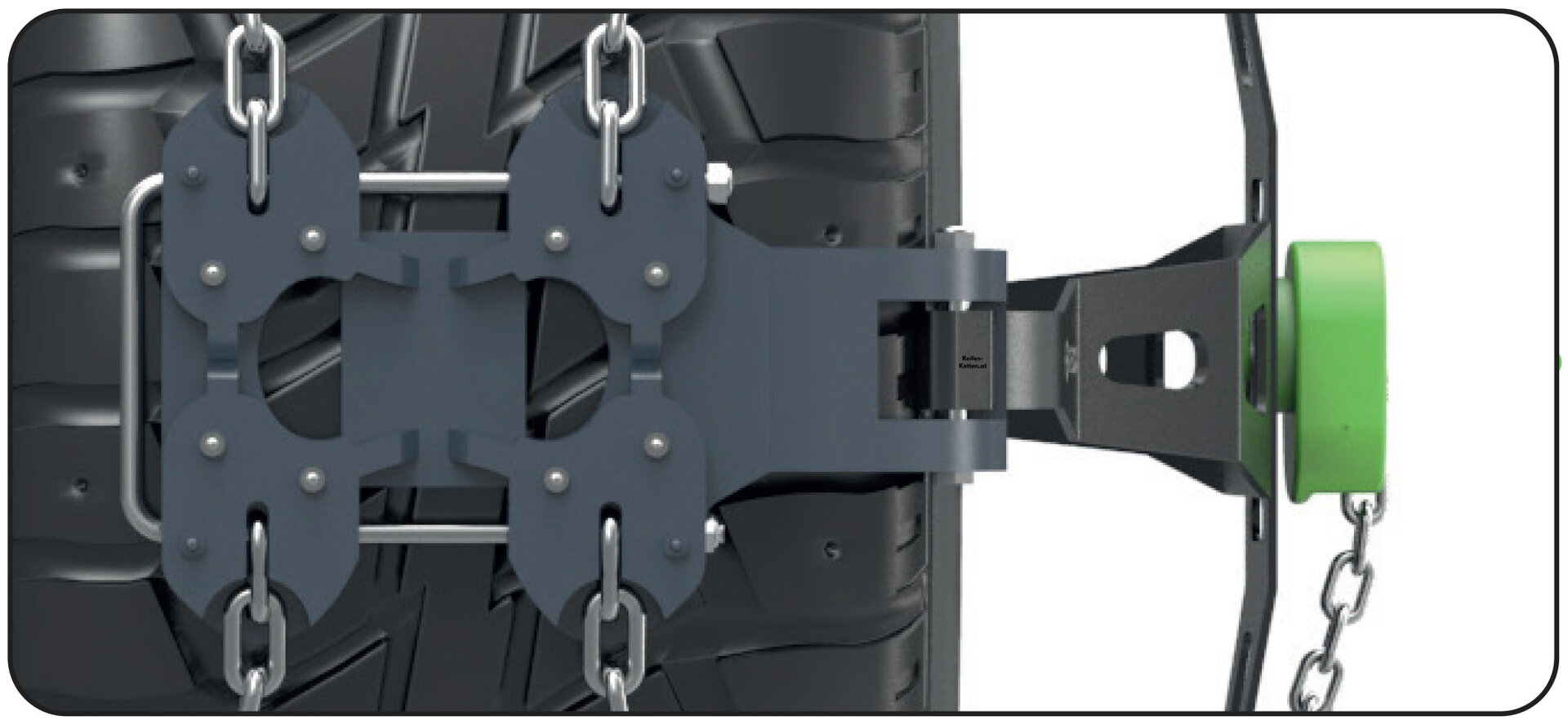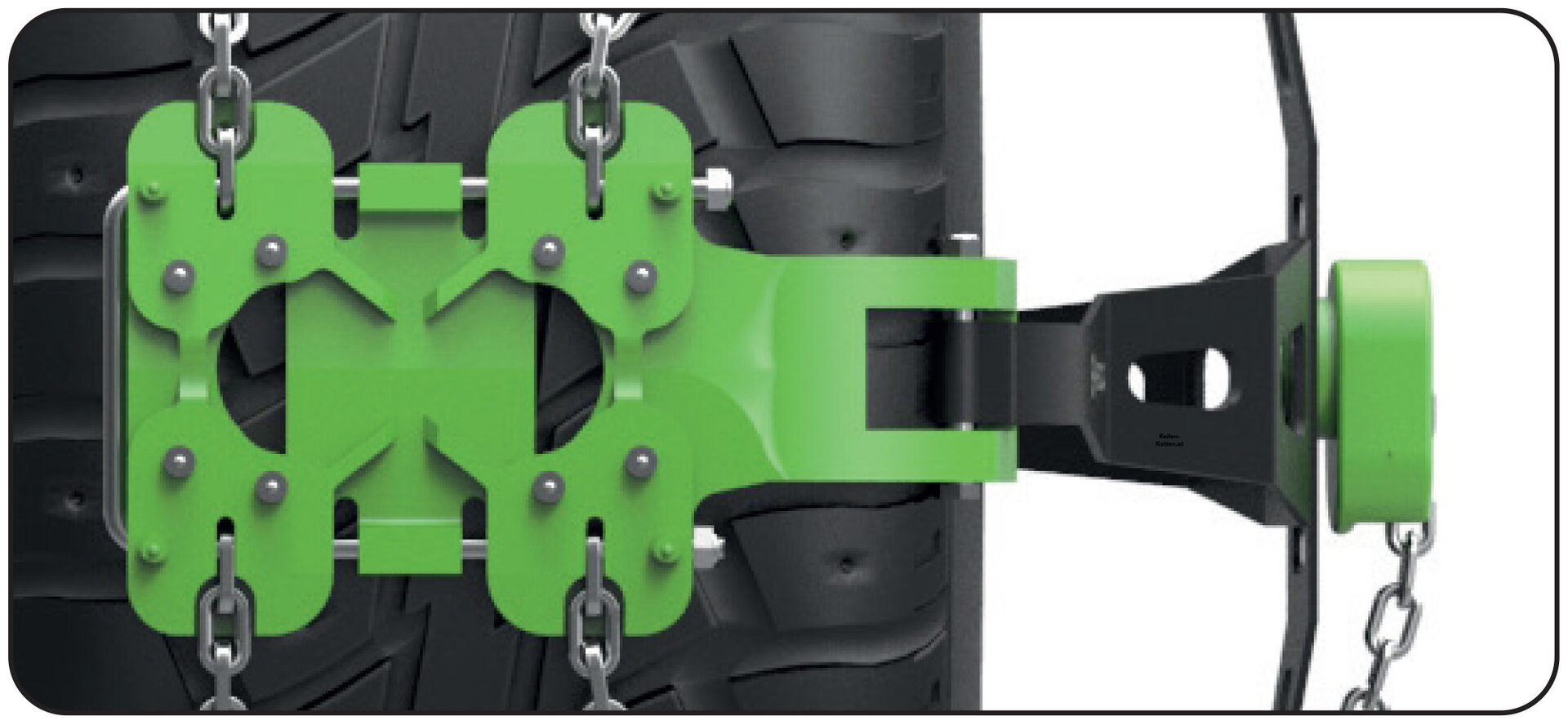 Ohne vorinstallierte Adapter und ohne spezielle Werkzeuge zum Spannen der Kette kann diese einfach mit den Händen an der Radmutter befestigt werden. Weniger Komponenten bedeuten auch eine optimierte Produktion, weniger eingesetzte Rohstoffe und eine reduzierte CO2-Bilanz.