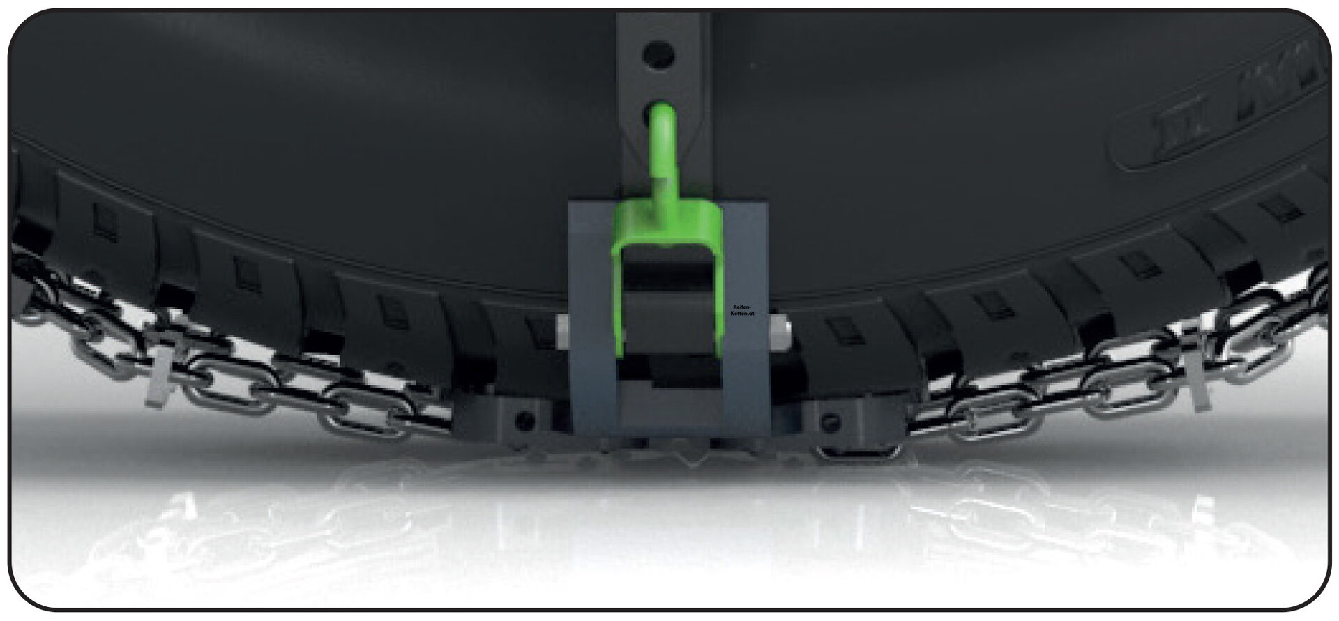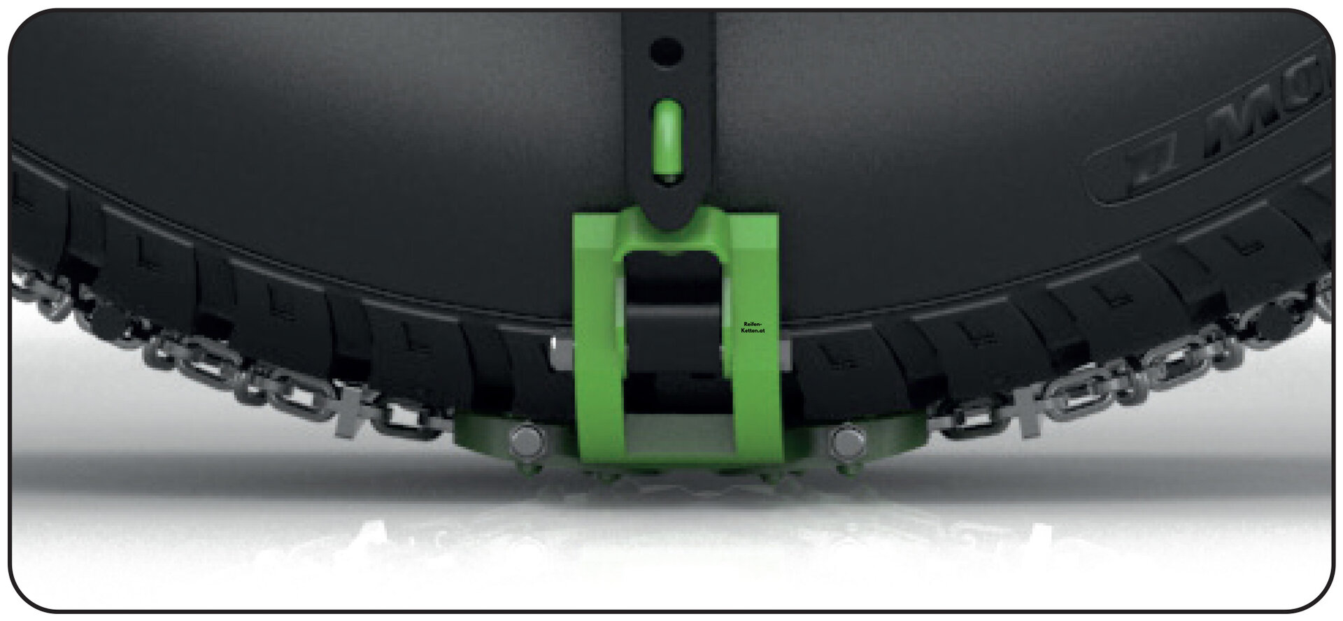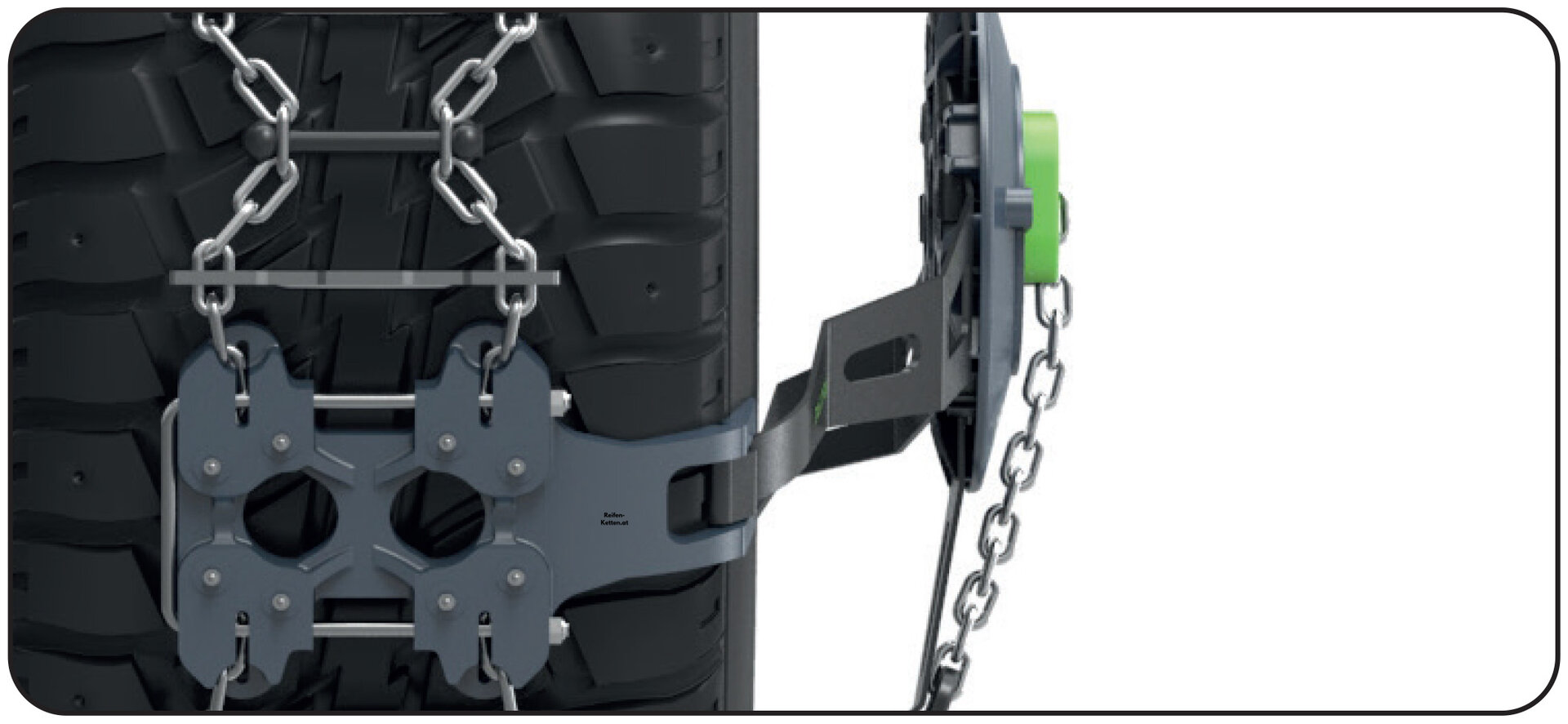 Ohne vorinstallierte Adapter und ohne spezielle Werkzeuge zum Spannen der Kette kann diese einfach mit den Händen an der Radmutter befestigt werden. Weniger Komponenten bedeuten auch eine optimierte Produktion, weniger eingesetzte Rohstoffe und eine reduzierte CO2-Bilanz.