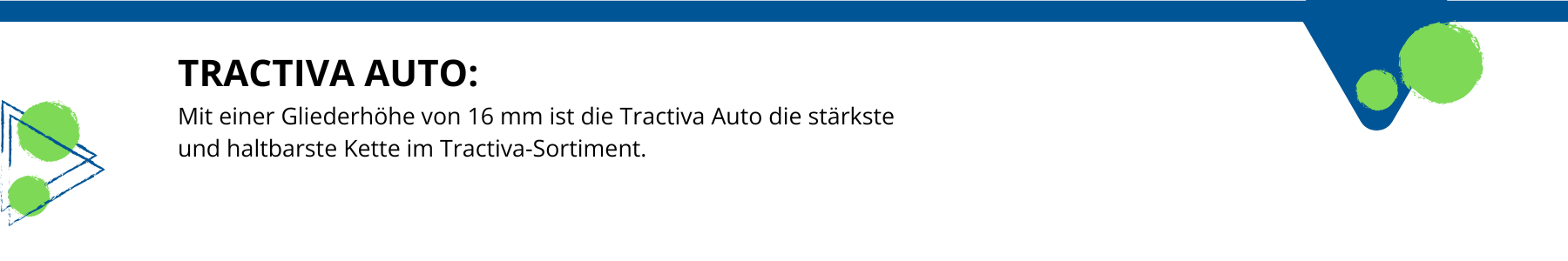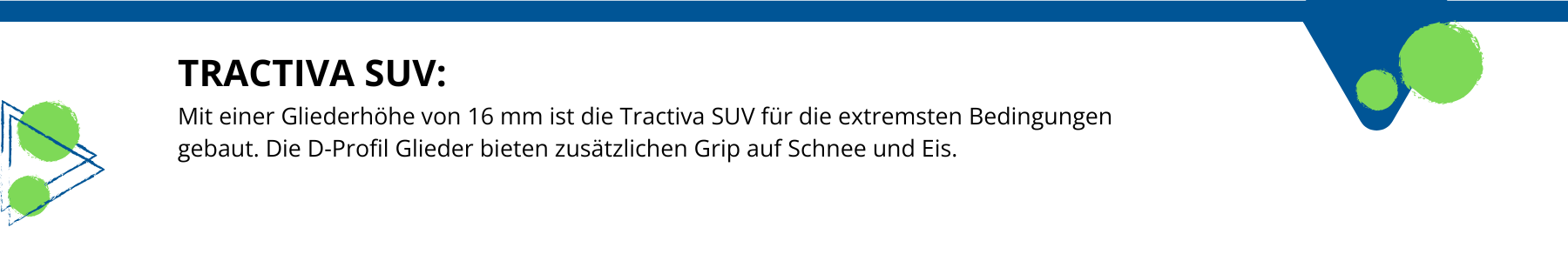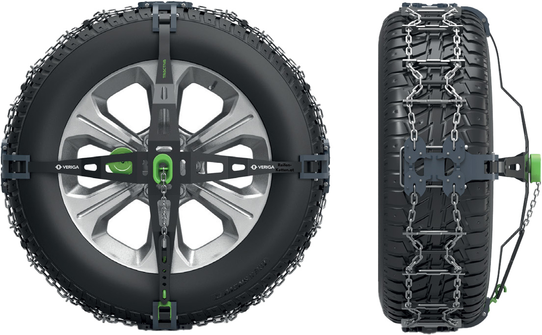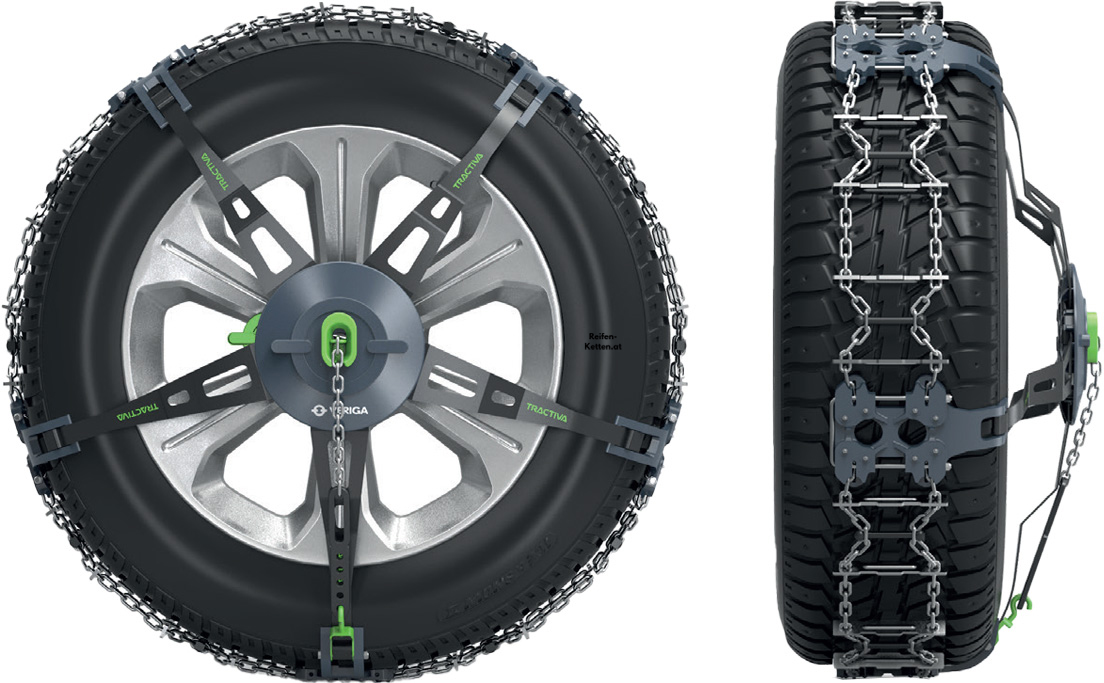 Die Veriga Tractiva repräsentiert die nächste Stufe in der Evolution der herkömmlichen Schneekette. Sie ist robust, einfach zu handhaben, belastbar und äußerst effizient. Die Tractiva vereint umfangreiche Stunden an Forschung, Tests, Verbesserungen und Anpassungen, um die zuverlässigste Schneekette zu entwickeln, die gleichzeitig leicht zu montieren ist.